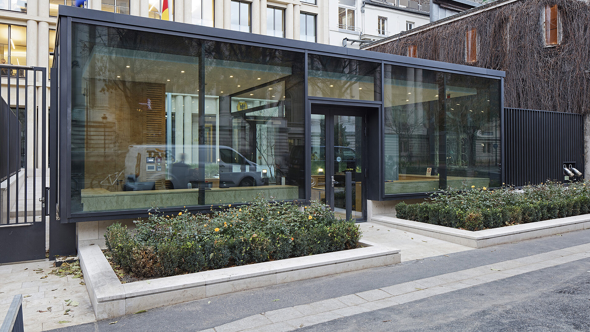 For a German embassy abroad with a security façade made from box profiles and an aluminium add-on construction, which is able to bear the 2+ tonne weight of the 4.6 x 3.2 m individual security glazing with ease.
