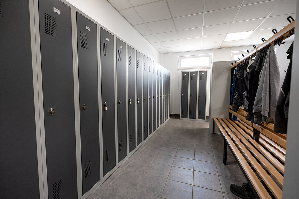 In der Umkleidekabine hat jeder Mitarbeiter der Fertigung einen eigenen abschließbaren Spind mit genug Platz für Kleidung, Schuhe und private Gegenstände.